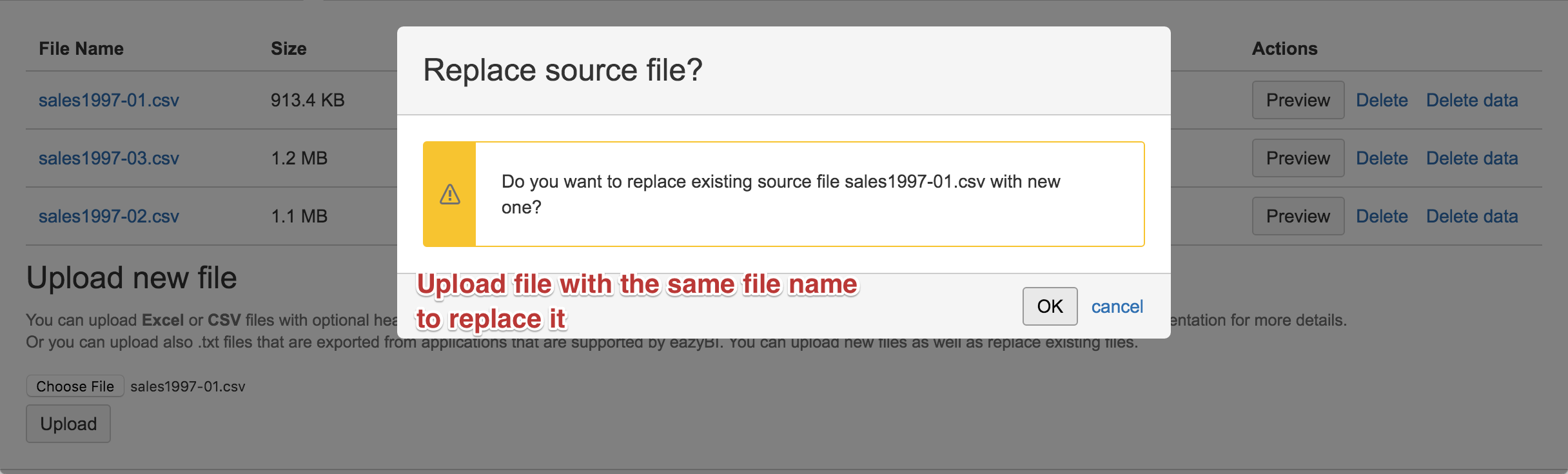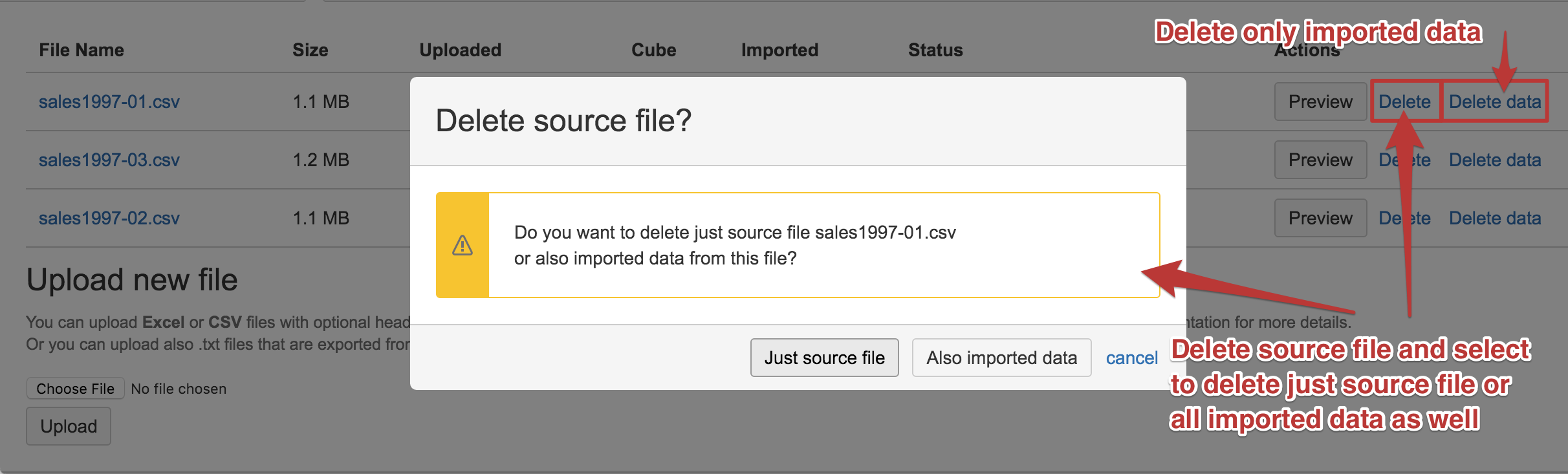 You can also delete either successfully imported files or files in error status. When deleting source file you need to specify if you want to delete just source file or to delete also from data cube all imported data from this source file.