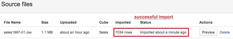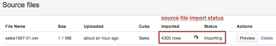 If there are no columns mapping errors then source file import will be started in background and you will see file import status (and how many rows are imported) which will automatically refresh.