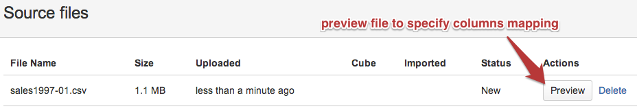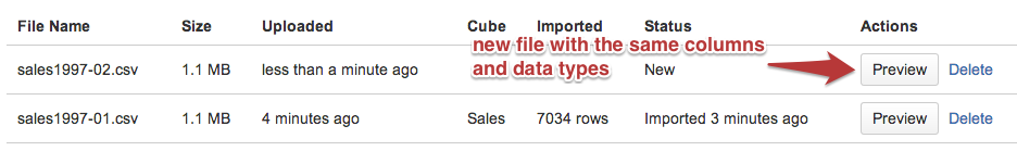 If new source file has the same structure (same column names and data types) as existing imported file then columns mapping will be copied from already imported file. After clicking on Preview button you will be able to import it by clicking Start import button.